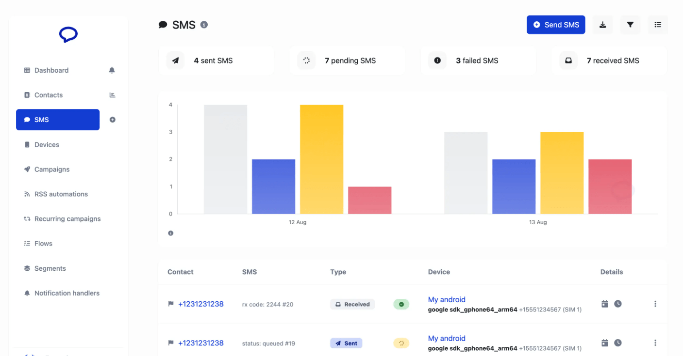 Turn your Android phone(s) into an SMS gateway to send bulk messages via API or web interface.